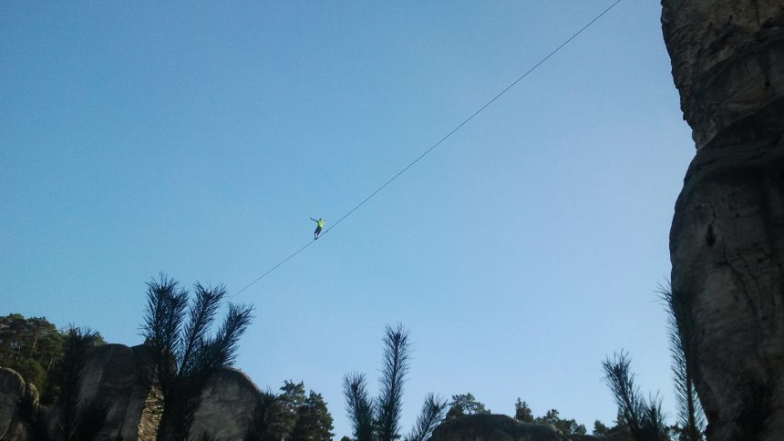 Slacklining as an extreme sport is just beginning to pick up in popularity. One might liken it to tightrope walking as it has similarities. However, slacklines are looser than tightropes (hence the names) and those who walk along them do so without a pole to assist in balancing. The strap itself is known as “webbing” and is suspended above the ground and anchored between two points.
